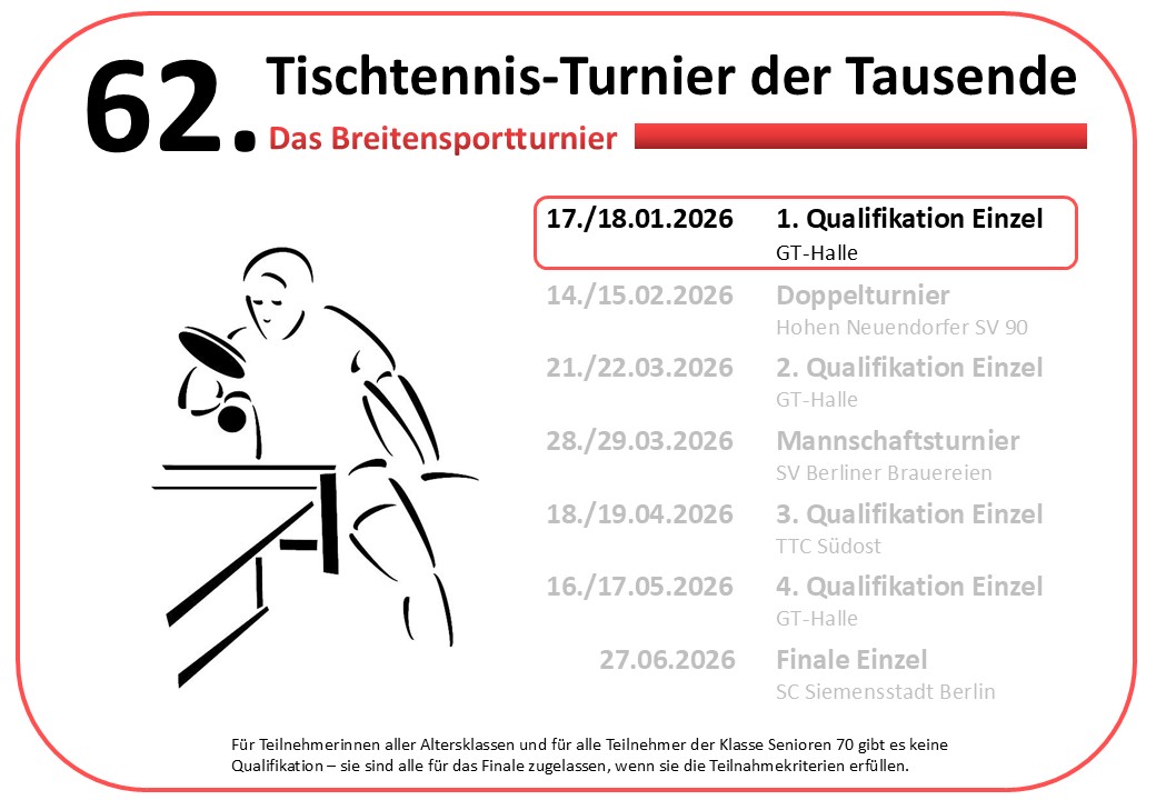 am Samstag 17. Januar 2026 und Sonntag 18. Januar 2026 findet das erste Qualifikationsturnier zum Tischtennis-Turnier der Tausende statt.