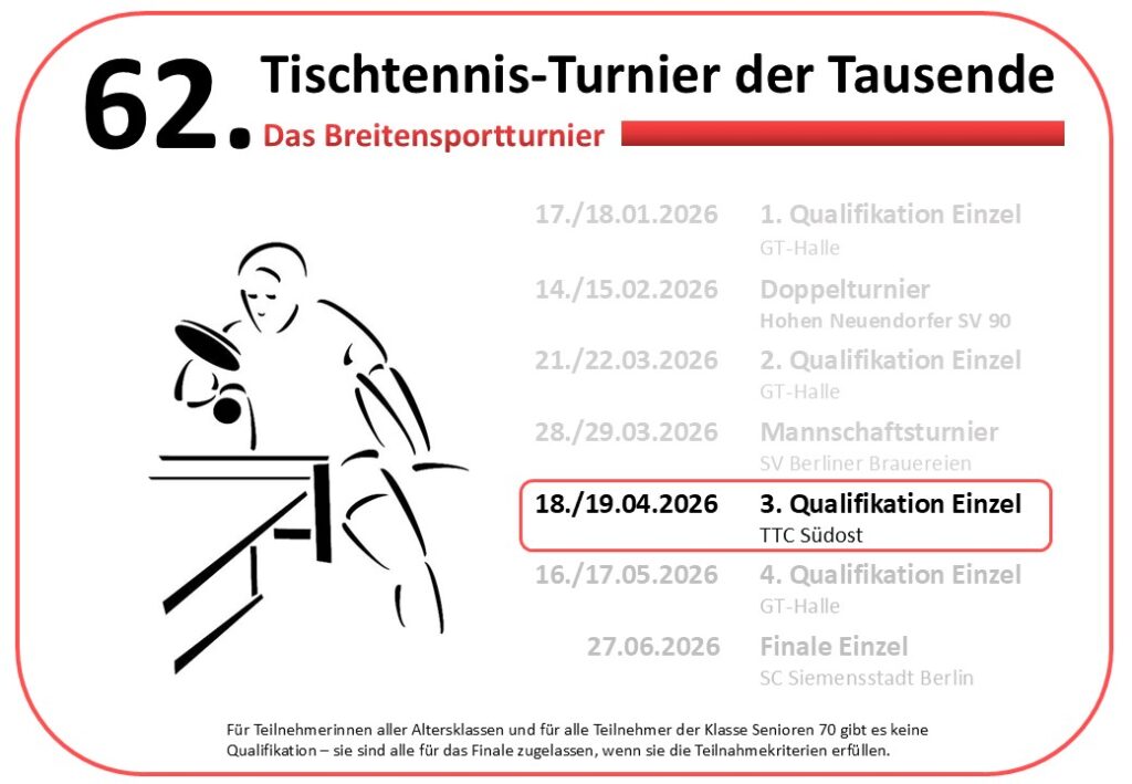 am Samstag 18. April 2026 und Sonntag 19. April 2026 findet das dritte Qualifikationsturnier zum Tischtennis-Turnier der Tausende statt.