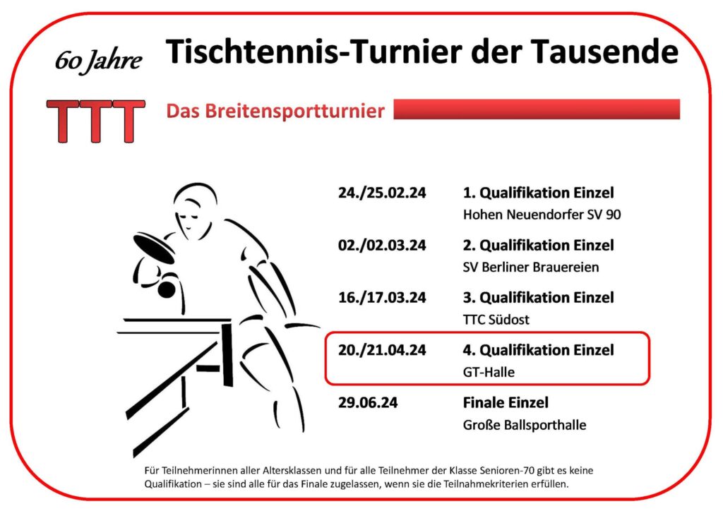 - 11.04.2024Die diesjährige Sportwartetagung des Berliner Tisch-Tennis Verbands findet am 14. Mai um 18:30 Uhr im Clubraum im Funktionsgebäude (1.OG, über…