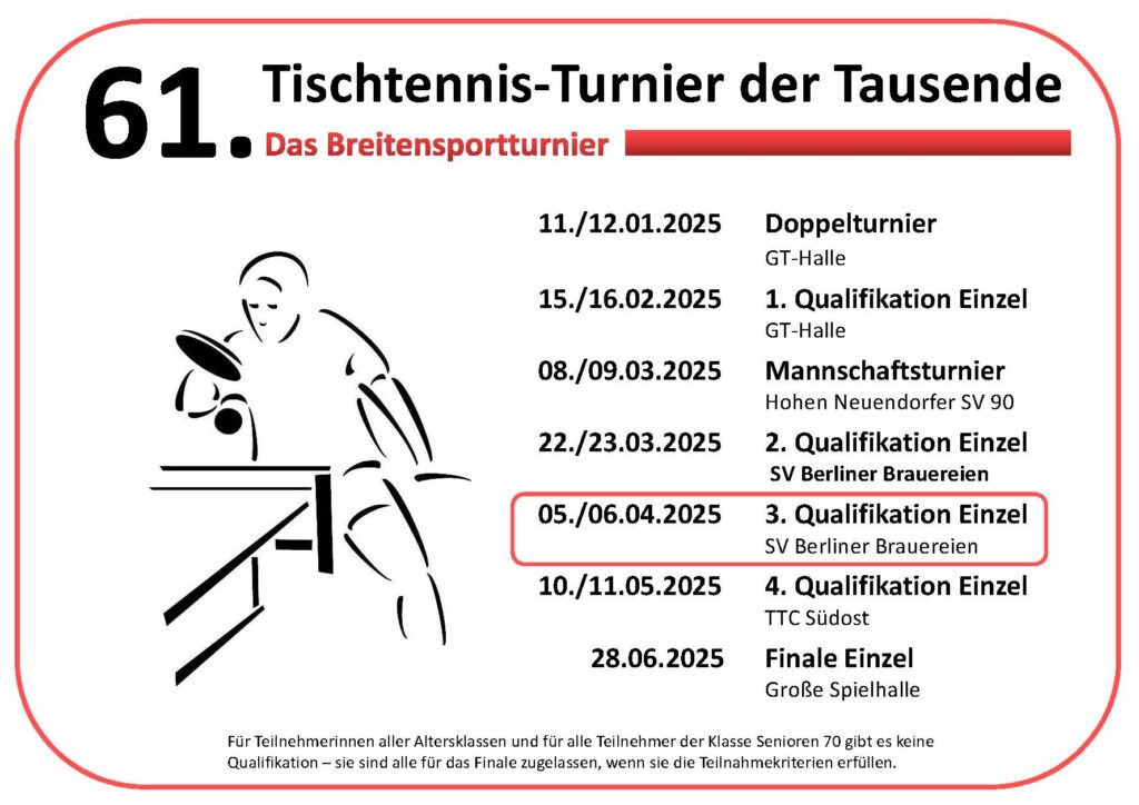 - 14.04.2025Der TSV Marienfelde richtet am 24.05.2025 ein Race-Turnier aus: Klassen: (Einteilung nach LivePZ am 11. Mai 2025)Jugend 15: LivePZ von…