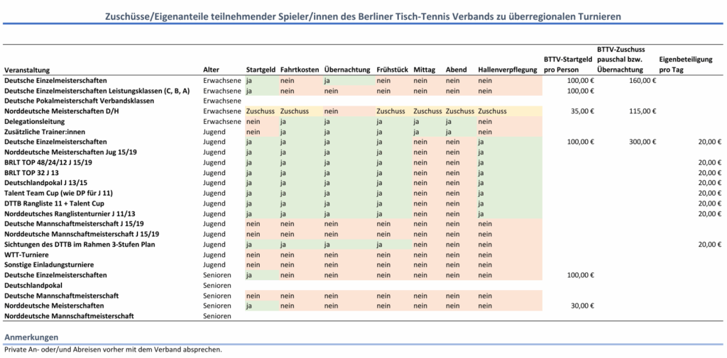 Präsidium und Jugendausschuss (für den Jugendbereich) haben sich auf folgende Regelungen für die Kostenbeteiligung des BTTV bei überregionalen Turnieren bzw. Zuschüsse/Eigenanteile teilnehmender Spieler/innen des Berliner Tisch-Tennis Verbands zu überregionalen Turnieren geeinigt.